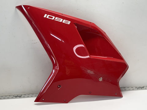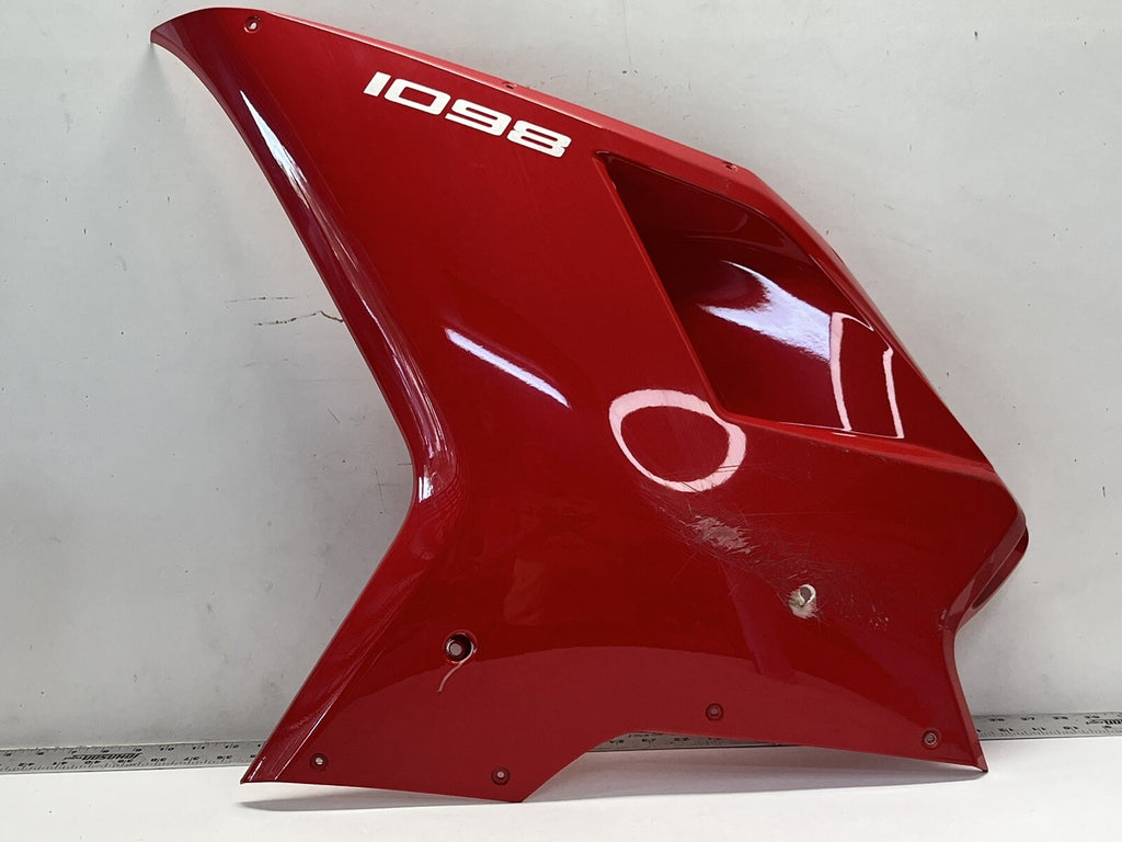 Ducati 1098 LEFT MID Cowling Fairing is in FAIR condition and comes as seen in the pictures. Please check with your dealer for fitments and compatibility before you bid. HAS SCRATCHES , HOLES AND CRACKS NEEDS REPAIR
