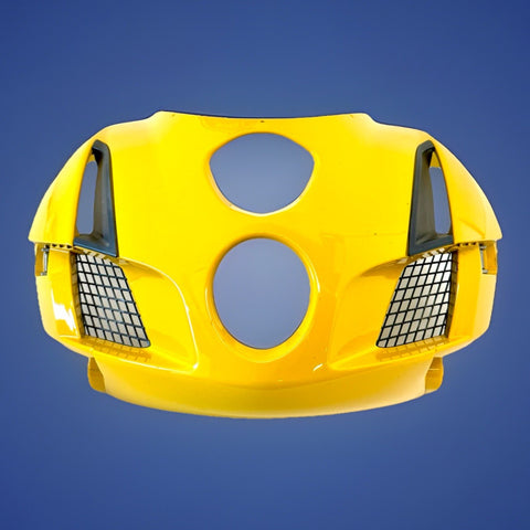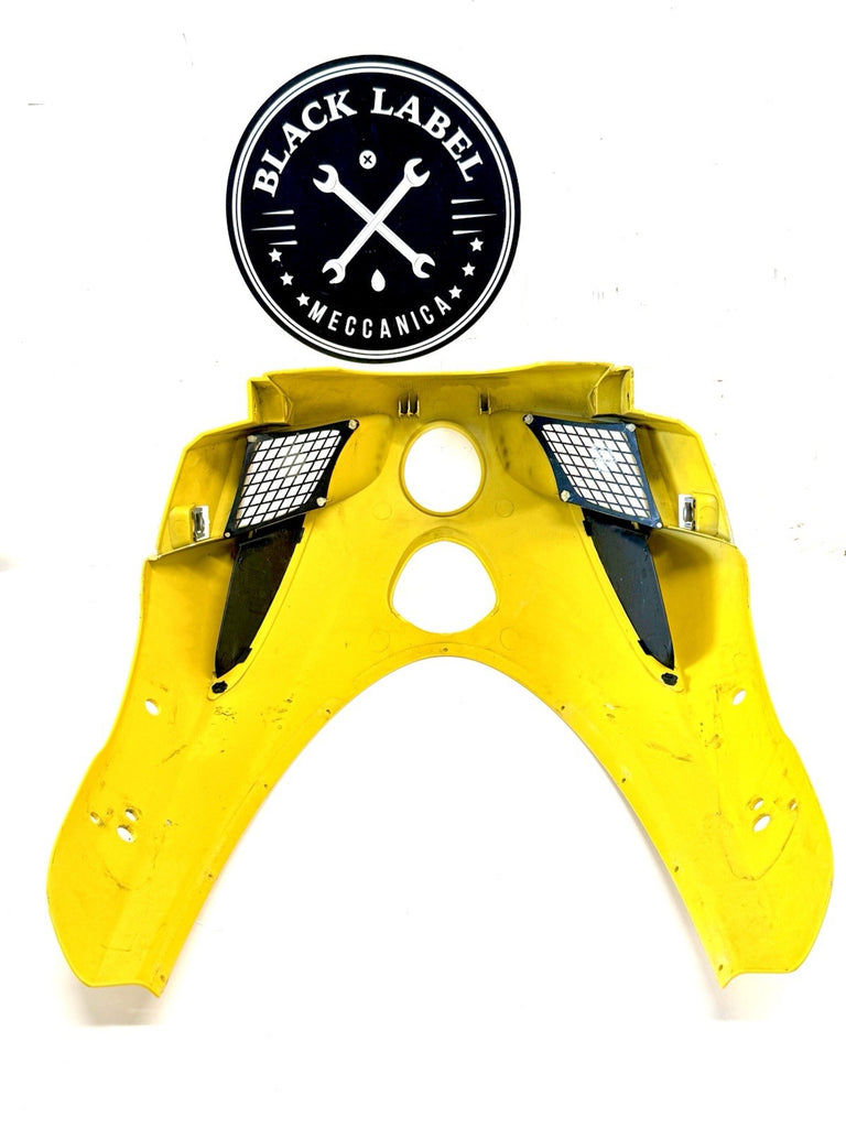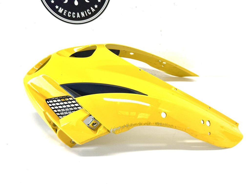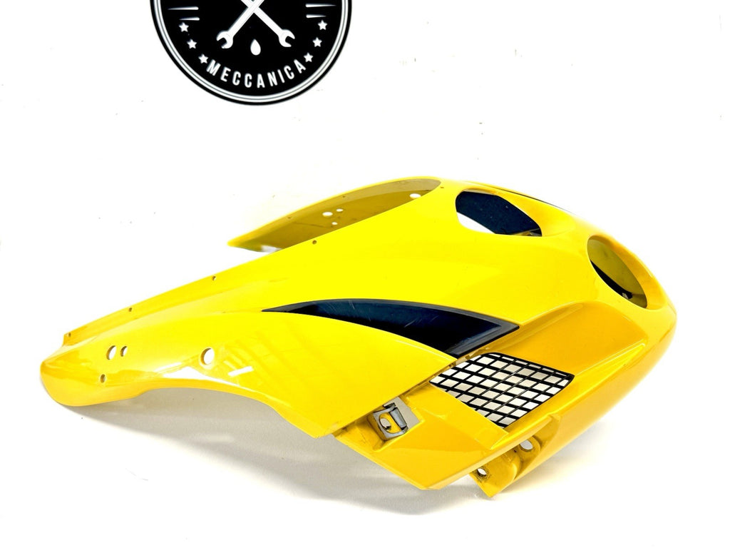 The product is a genuine front headlight fairing for Ducati 03-04 749 999 motorcycles made in Italy. The fairing needs paint and comes in a yellow color. It is made of ABS material and includes one piece. The manufacturer part number is 48110251AB, and it is designed to be placed on the upper front part of the vehicle. This high-quality fairing is a perfect choice for customizing and restoring your Ducati motorcycle to its original condition.