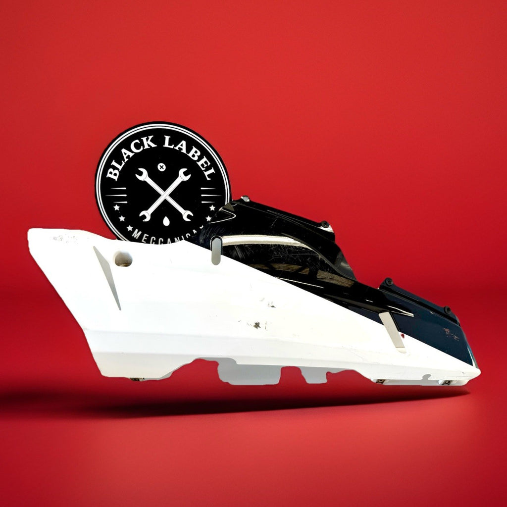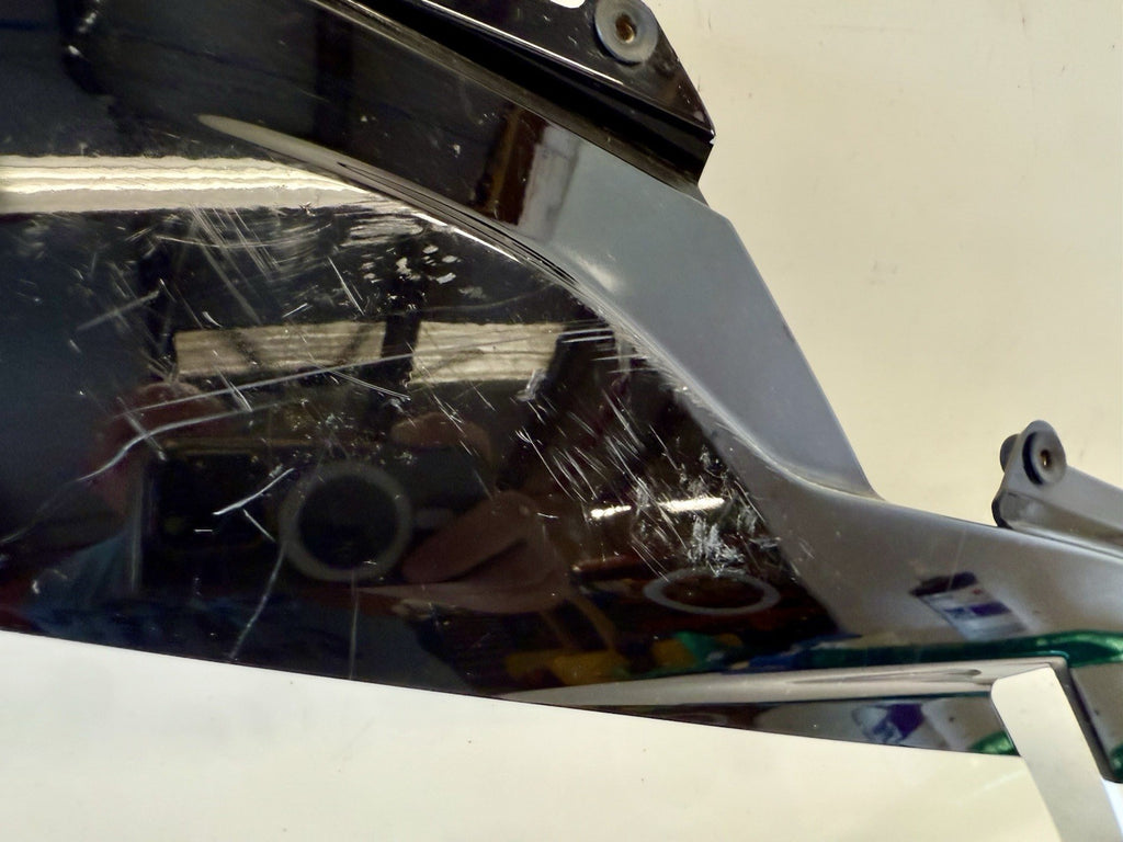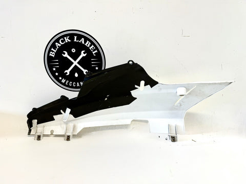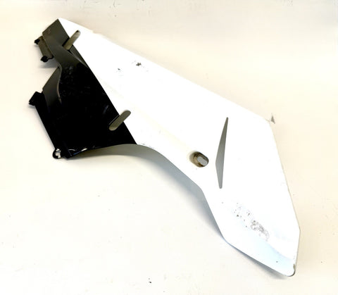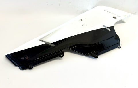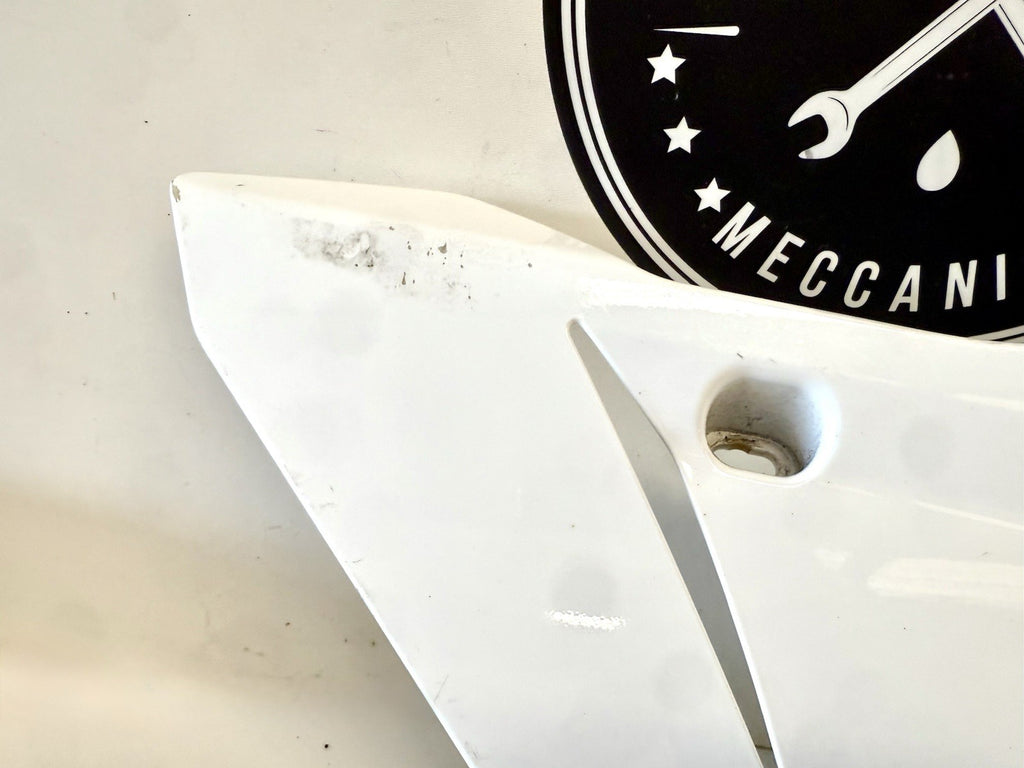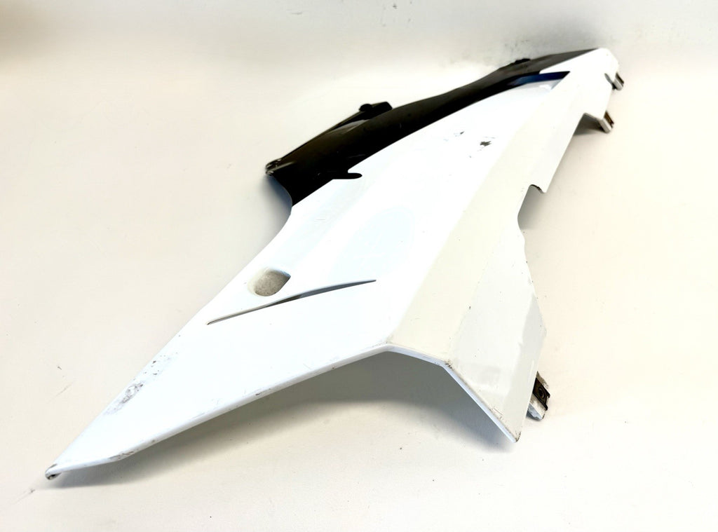 White color. Made of ABS material in Italy, this painted fairing is designed to fit the lower right side of the vehicle. It has minor paint chips and scratches, which may need to be addressed for a perfect finish. .The part number 48032302A confirms its authenticity as a Ducati OEM part.