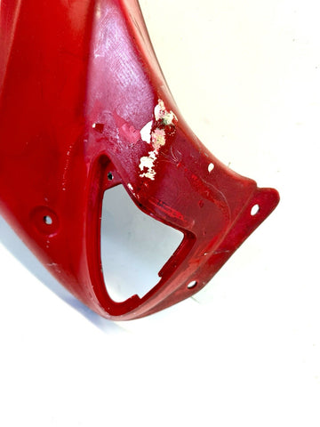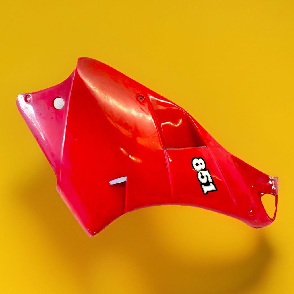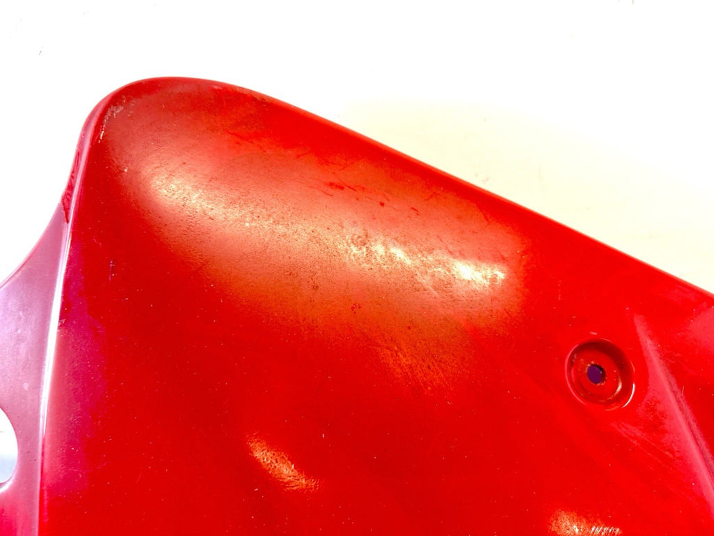 Up for sale is a genuine Ducati 851 right side upper fairing cowl panel, part number 48030021C. This red-colored fairing is made of fiberglass reinforced plastic (FRP) and ABS plastic, finished with paint. It is a single piece fairing, specifically designed for the right side of the motorcycle. The fairing is used but in good condition with minor cracks. This fairing fits Ducati 851 models, and it is manufactured in Italy. Get this OE/OEM part number 48030021C.