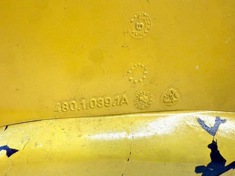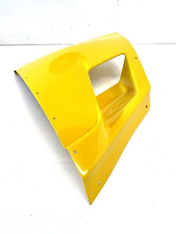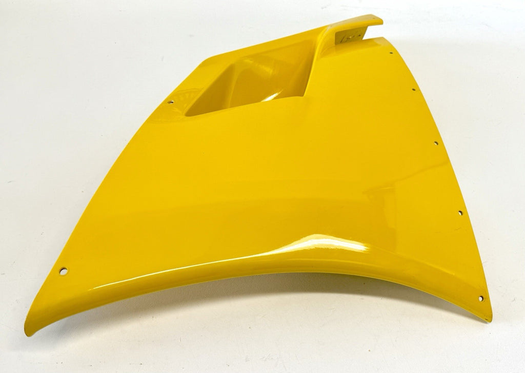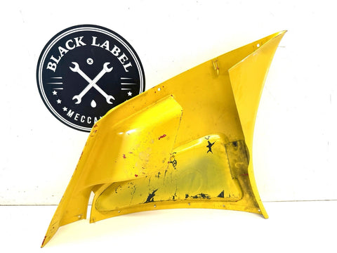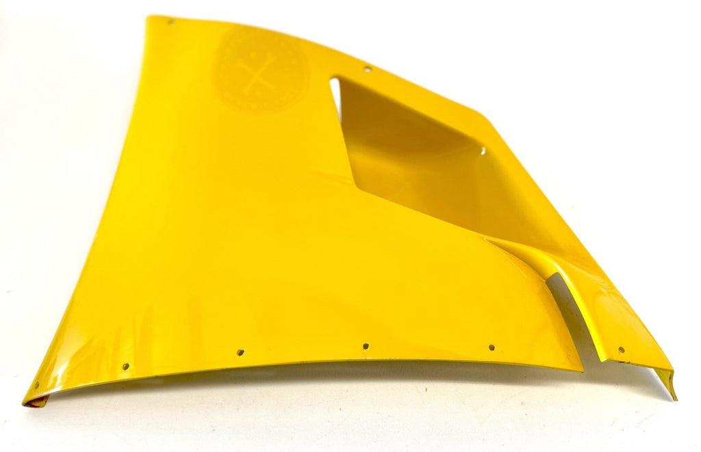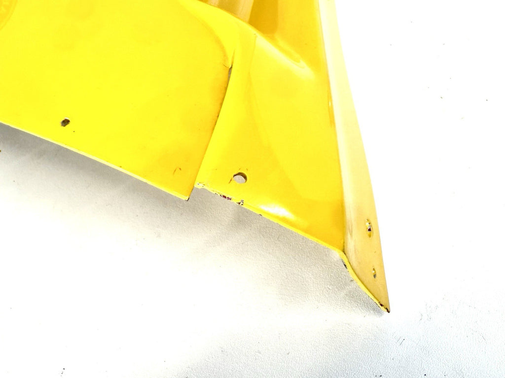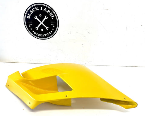 This product is a genuine Ducati 996 748 916 yellow mid fairing cowling left, made of ABS plastic and pre-drilled for easy installation. It is a non-domestic, single piece item manufactured in Italy, featuring a painted finish. This side fairing is designed for the left side of the vehicle and is a high-quality replacement part with the manufacturer part number 48010391A. Please note that this item is used . It can be used as is or you can restore it to it original aesthetics by having it professionally painted