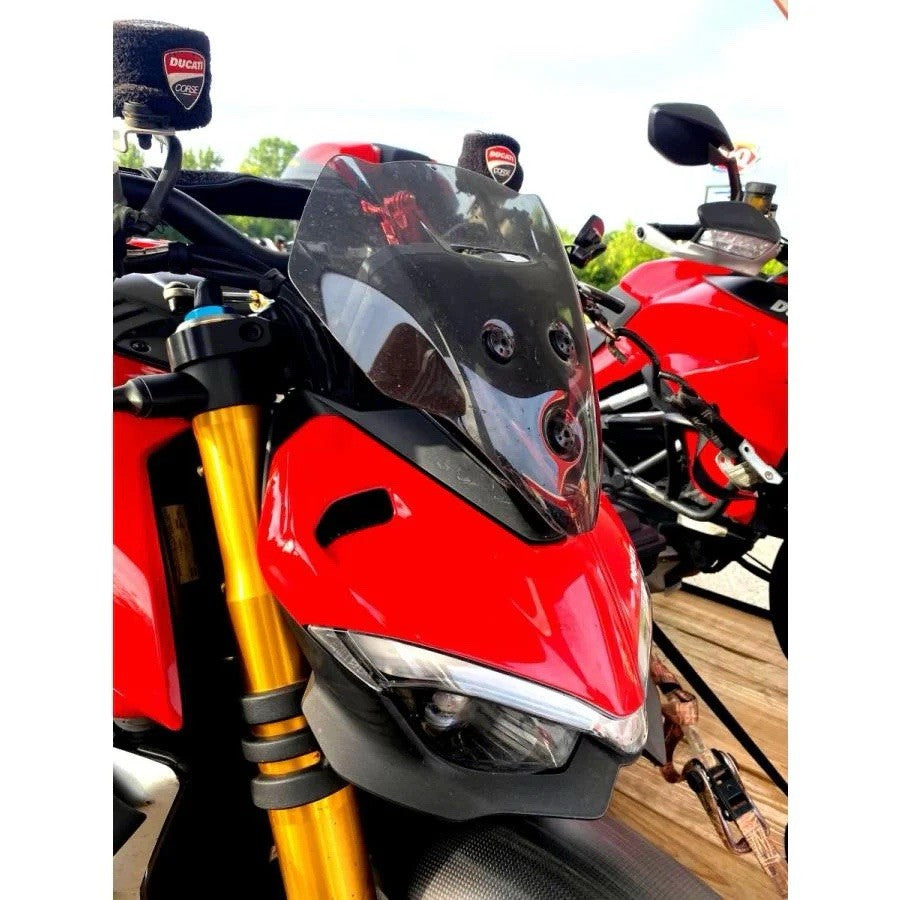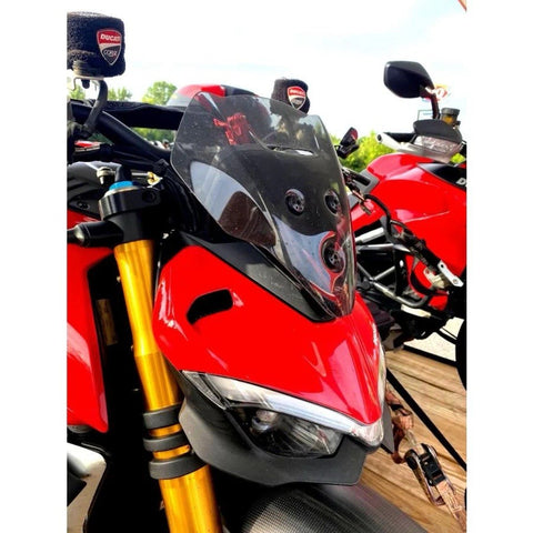 Enhance your Ducati's aerodynamic efficiency and style with the genuine Ducati Performance Headlight Fairing Screen, designed specifically for the Streetfighter V2. Crafted with precision in Italy, this light smoke tinted windshield ensures a perfect fit and an improved riding experience, thanks to its easy installation process.