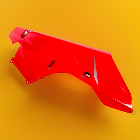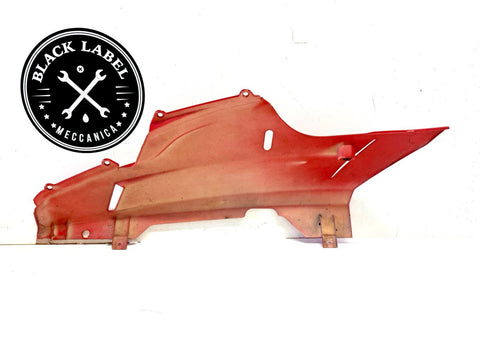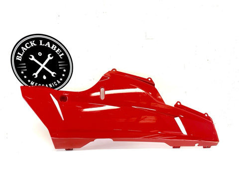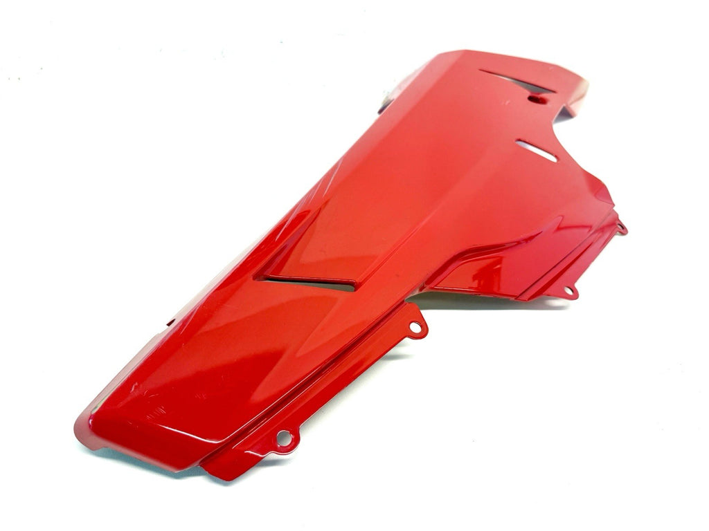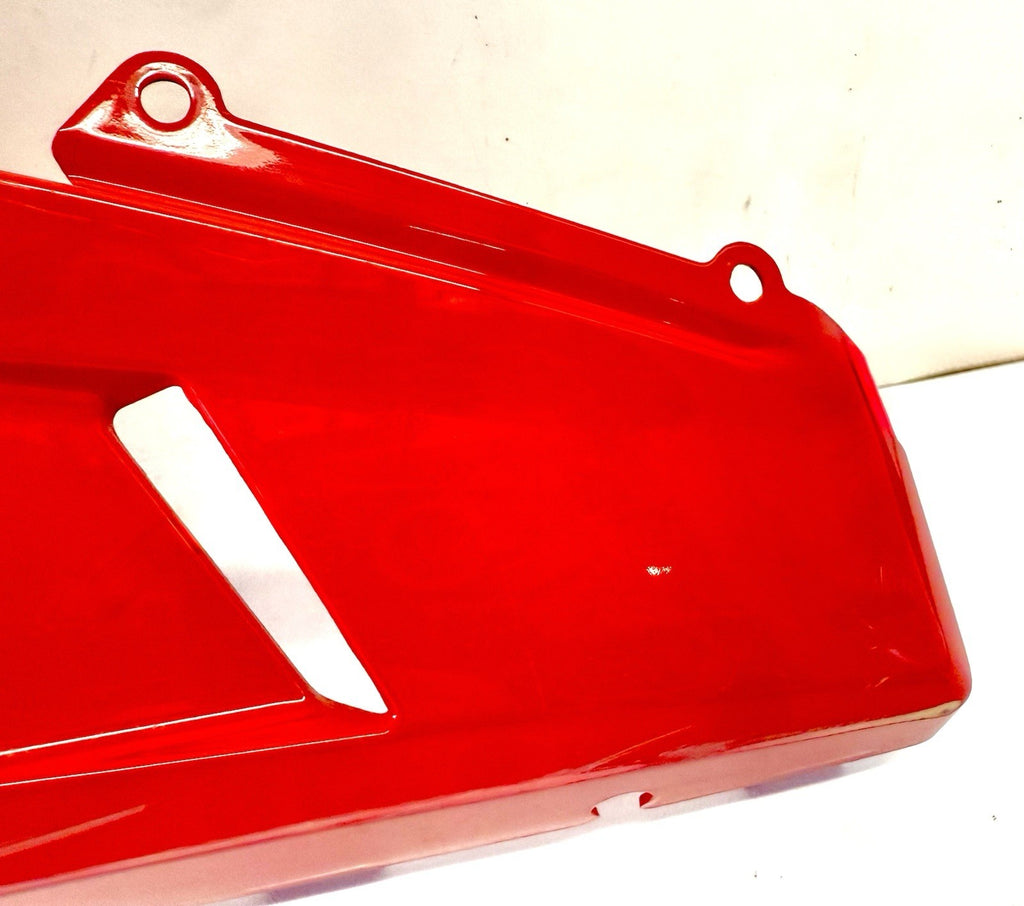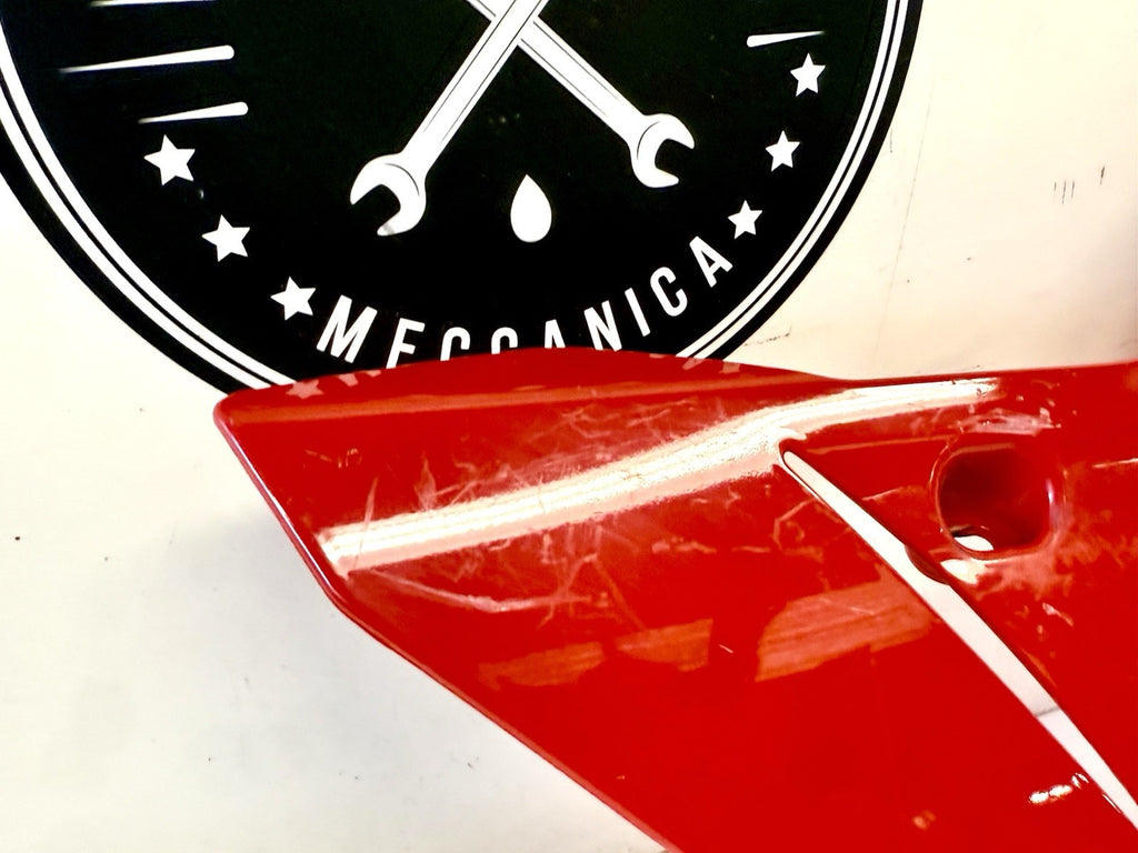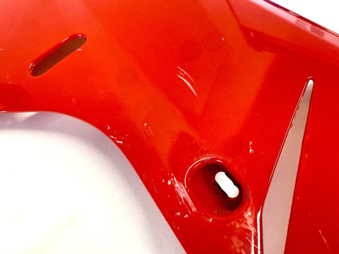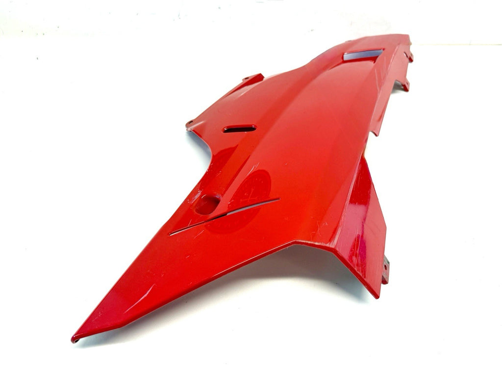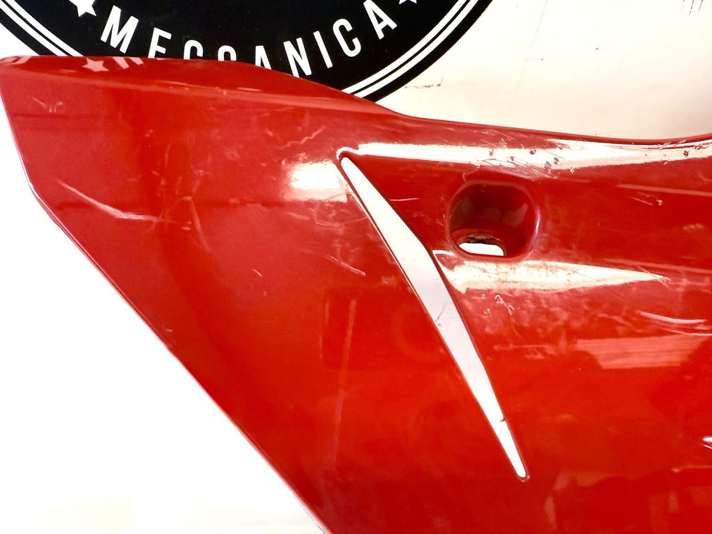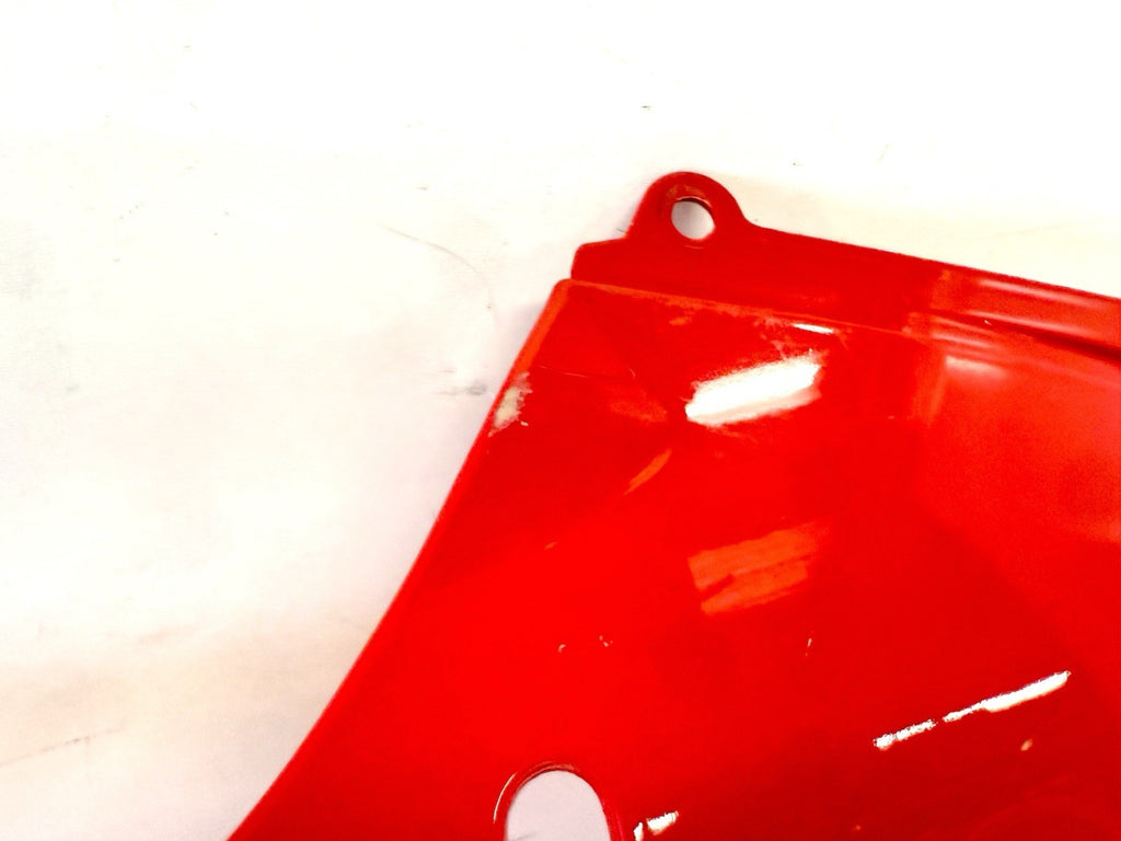 This product is a genuine OEM Ducati 848 1098 1198 right side lower fairing cowl in red color. Made of ABS material in Italy, this painted fairing is designed to fit the lower right side of the vehicle. It has minor paint chips and scratches, which may need to be addressed for a perfect finish. The part number 48032302A confirms its authenticity as a Ducati OEM part.