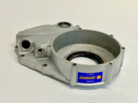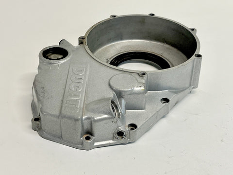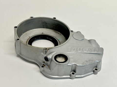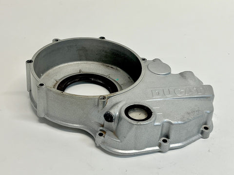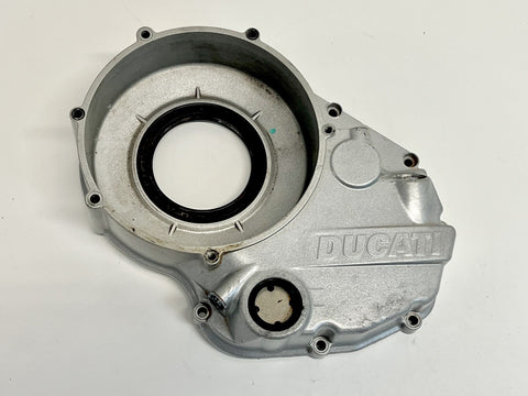 This genuine Ducati clutch case cover is a used item that fits the 749 and 999 S R models. Made in Italy, it is designed to fit on the center of the engine and is silver in color. The cover is designed to protect the clutch and is made from high-quality materials. The manufacturer part number is 24330381. This cover is a great addition to any Ducati enthusiast's collection and will help keep the engine running smoothly.