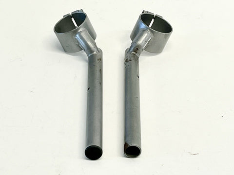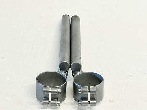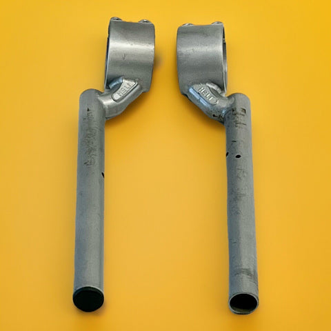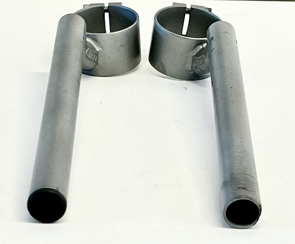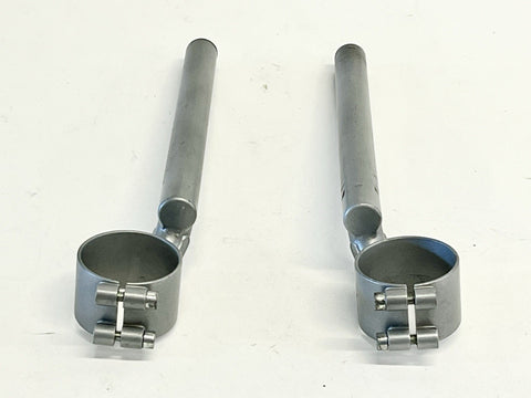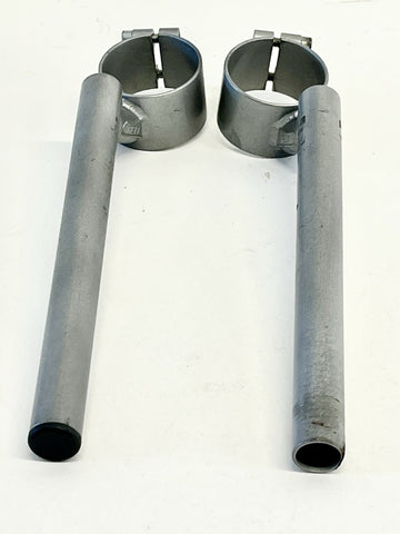 The product is a set of genuine HeliBars handlebar risers designed to fit Ducati 748, 916, 996, and 998 motorcycles. Made of steel in a silver color, the risers are ergonomic and easy to install. Manufactured in the United States, these HeliBars are compatible with handlebar diameters of 0.7 inches. With two pieces included in the set, these handlebar risers provide a sleek and practical solution for riders looking to enhance their motorcycle's handlebars.