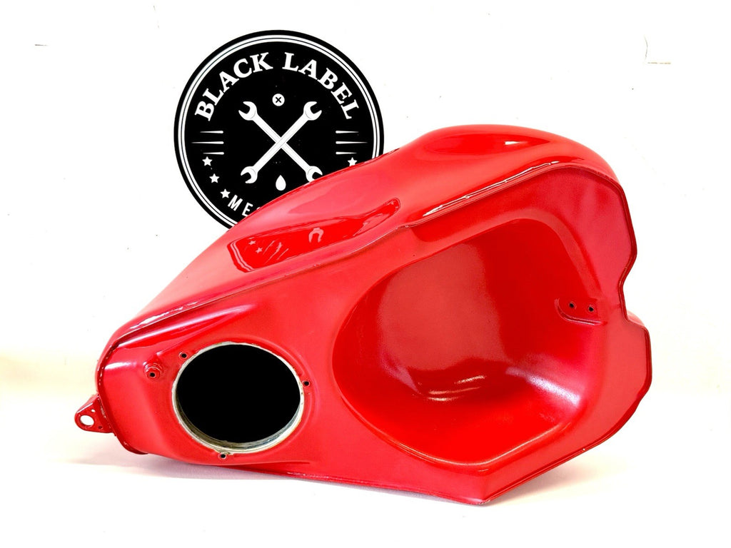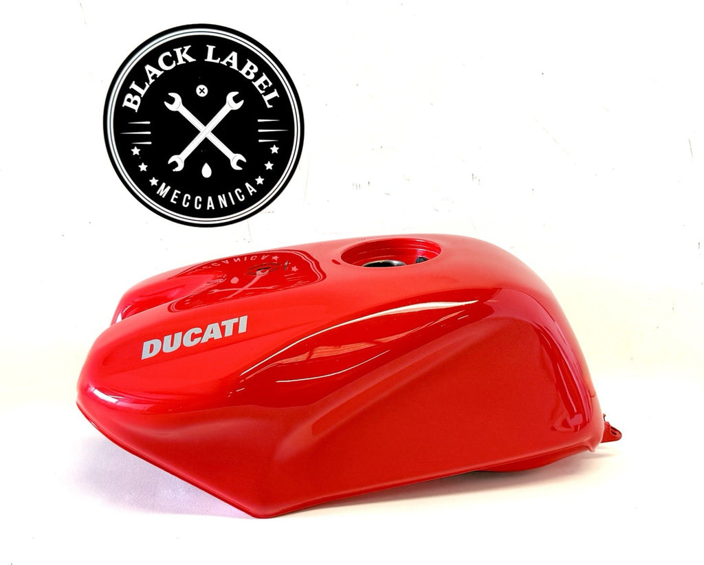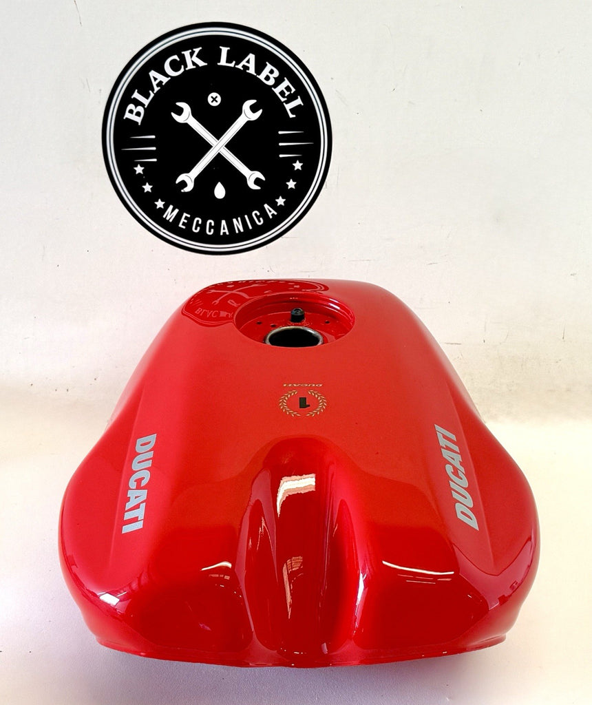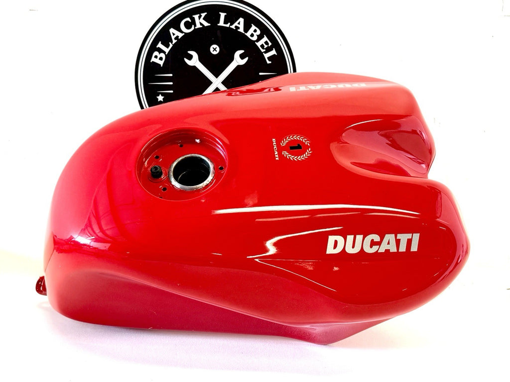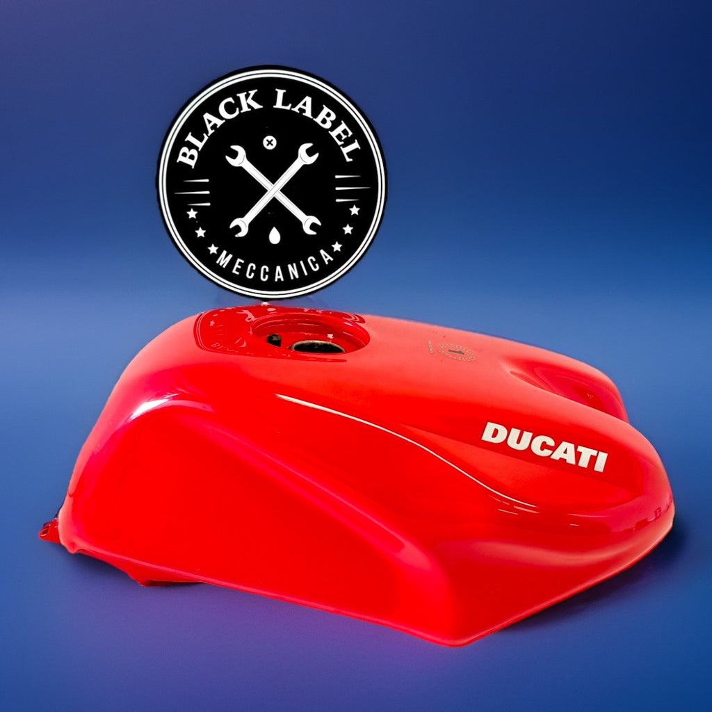 The product is a genuine OEM Ducati red fuel petrol gas tank, specifically designed for models from 1993 to 2004. This refurbished tank comes in a painted red finish. It is a single piece item and is suitable for the front placement on a motorcycle. Ideal for those looking to replace or upgrade their motorcycle's fuel tank with a high-quality, authentic Ducati part.