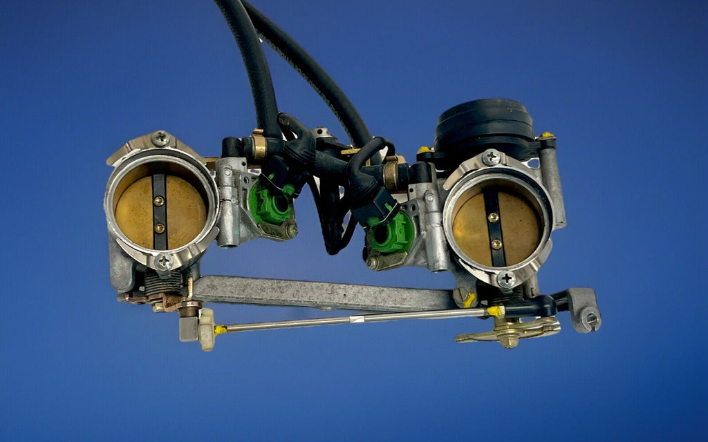 This listing offers a set of genuine Ducati throttle bodies, fuel lines, injectors, and TPS for 95-01 748 and 916 models. These parts are made of high-quality aluminum and rubber materials, ensuring durability and easy installation. The top style of the throttle bodies is made of plastic, which adds to the overall look of the part.