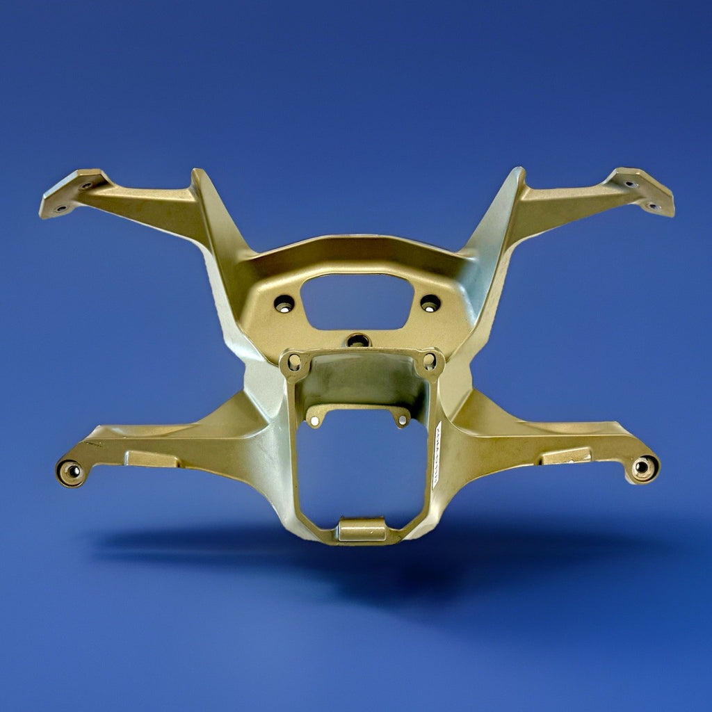 This Genuine Magnesium Ducati 1299 Headlight Upper Fairing Stay Bracket 8293E182A is a high-quality motorcycle part made by Ducati in Italy. It is designed to fit the Ducati 1299 Panigale/S/R 2015-2019 and Ducati 959 Panigale 2016-2019 models. The bracket is made of lightweight and durable magnesium material and features pre-drilled mounting holes for easy installation. The gold color adds a touch of style to the front of the motorcycle, making it a perfect choice for riders looking to upgrade their bike's appearance and functionality. This is used with wear, paint chips and smudges are to be expected