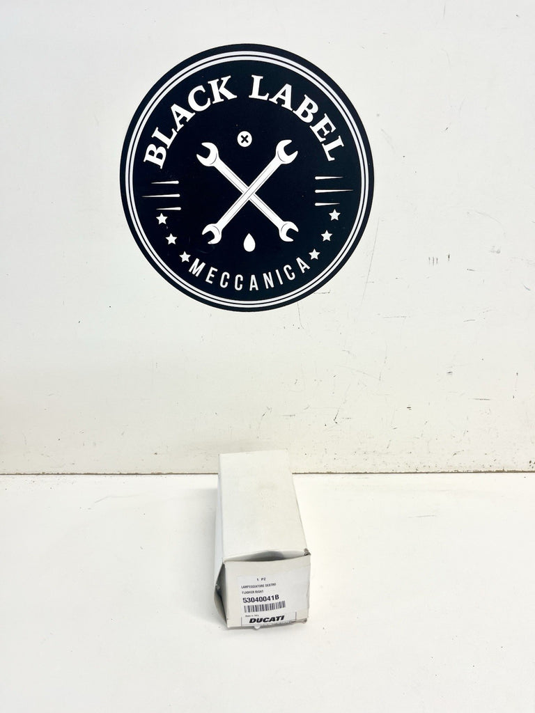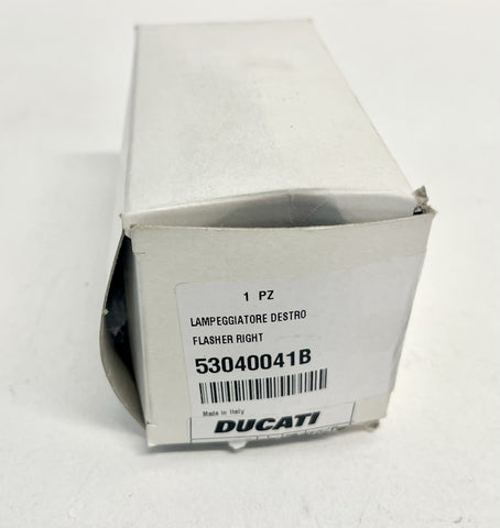 The product is a genuine new Ducati ST2 right rear turn signal indicator blinker directional, manufactured in Italy. It is a turn signal light assembly featuring SAE-certified halogen lighting technology. The manufacturer part number is 53040041B, ensuring compatibility and high-quality performance for your motorcycle or scooter. Trust in the Ducati brand for top-notch parts and accessories to enhance your riding experience.