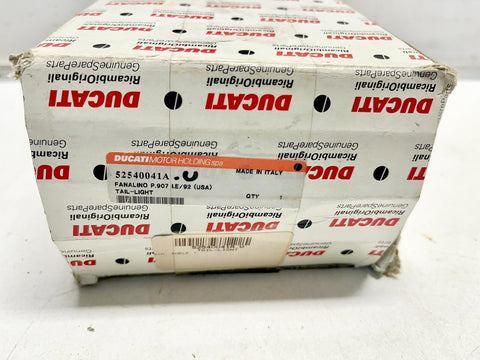 This is a brand new tail brake light assembly for a Ducati PASO 907 IE motorcycle. It is a genuine OEM part with the part number 52540041A and is DOT, SAE, and OE certified. The assembly includes 2 halogen bulbs and has universal fitment.