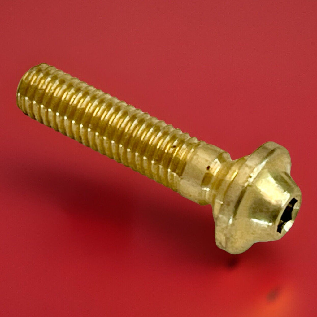 The product is a pair of OEM Ducati 848 1098 1198 special mirror screws bolts, designed for both the left and right side of the motorcycle. Made of brass with a gold color, these screws are manufactured in Italy and come in a set of two. The part number for these special mirror safety bolts is 77915441A, ensuring compatibility with Ducati motorcycles. Perfect for those looking to replace or upgrade their mirror screws, these high-quality bolts provide a secure and stylish solution for your bike.