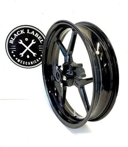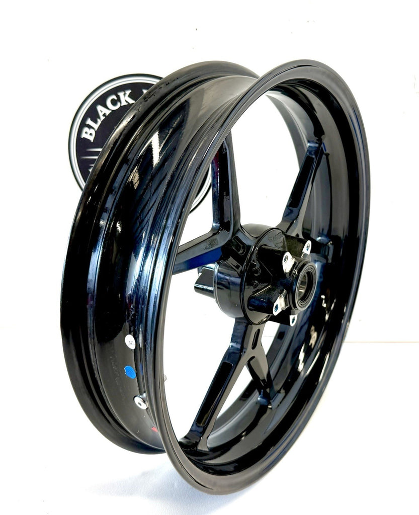 The product is a genuine OEM Ducati Monster 1200 S front wheel rim in black, with a diameter of 17 inches and a width of 3.5 inches. It is manufactured in Italy and features a painted finish. This one-piece cast wheel is designed for the front placement on the vehicle, making it a high-quality and durable replacement or upgrade part for motorcycle enthusiasts looking to enhance their Ducati Monster 1200 S. This wheel is straight and true and does come with a few paint chips . Look closely at pics