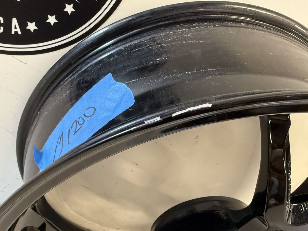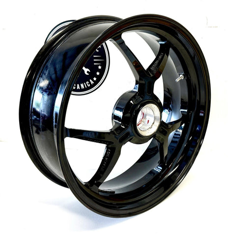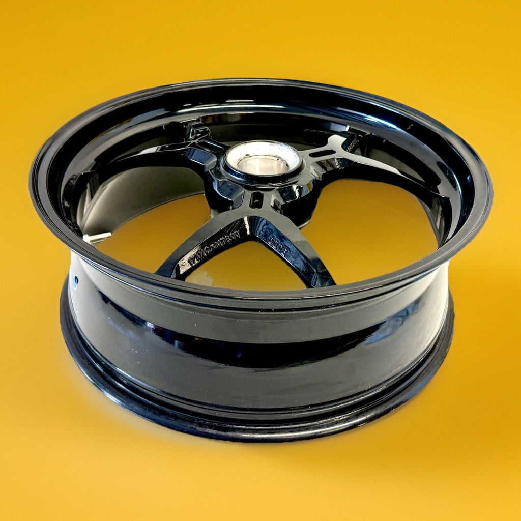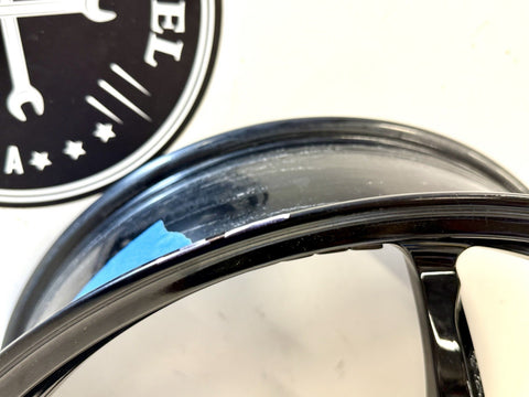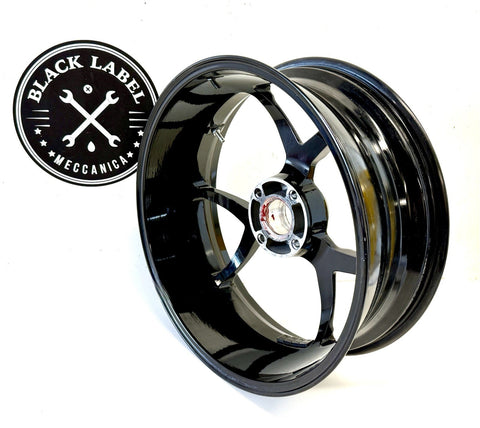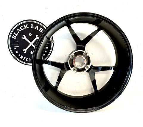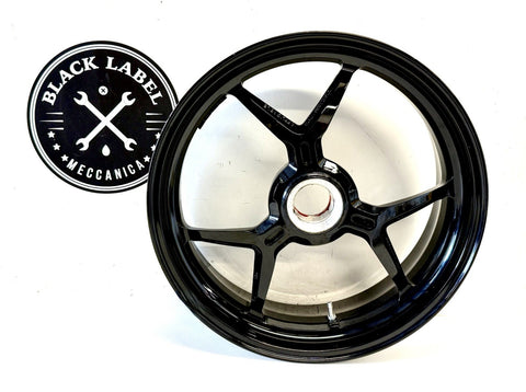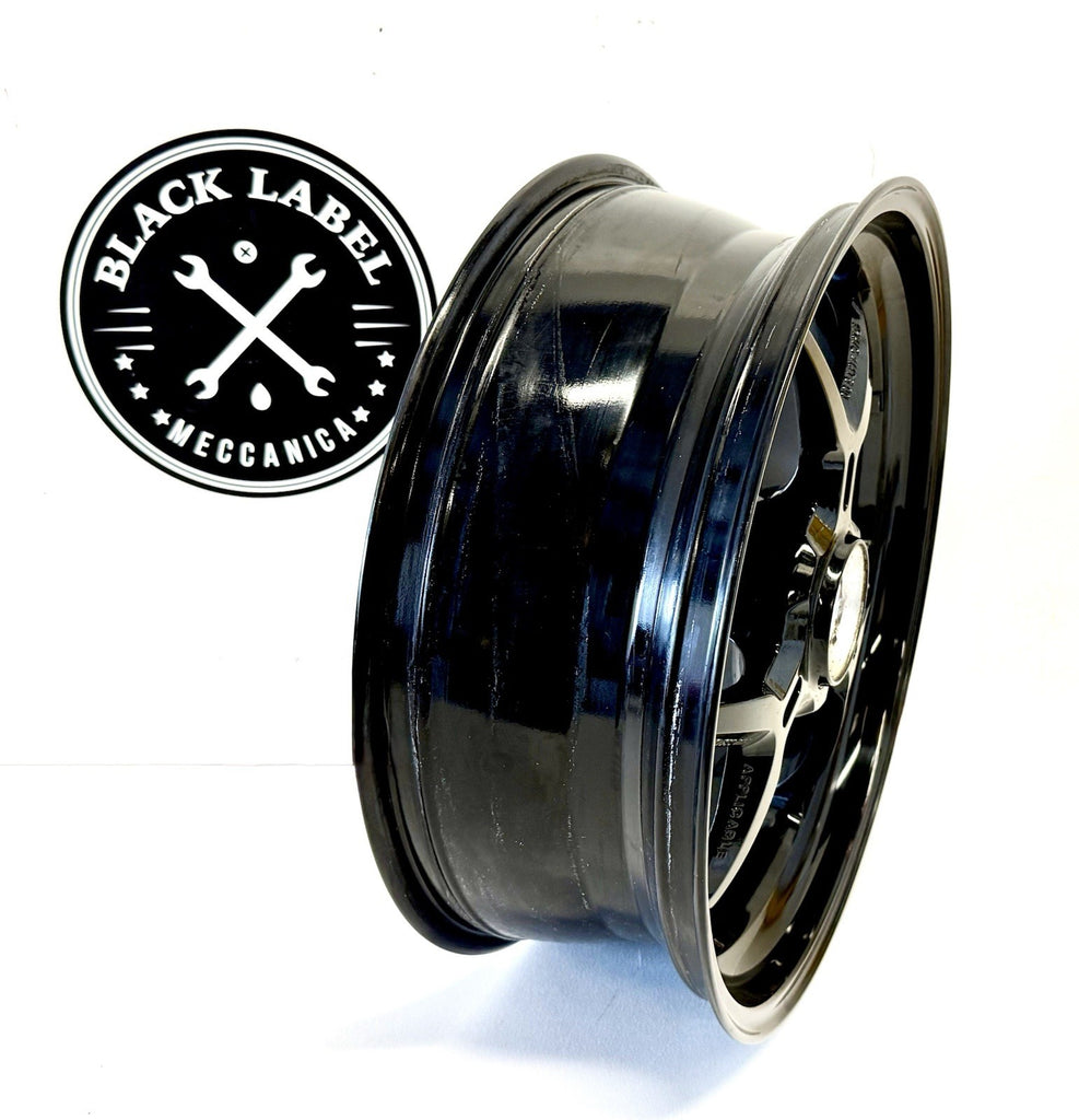 This product is a genuine used Ducati Monster 1200 S rear wheel rim, featuring a 6-spoke design in a sleek black color. Made of aluminum and manufactured in Italy, this one-piece cast wheel has a diameter of 17 inches and a width of 6 inches, providing a stylish and high-quality addition to your motorcycle. The painted finish adds a touch of craftsmanship to this wheel, which is sure to enhance the overall look of your Ducati motorcycle.